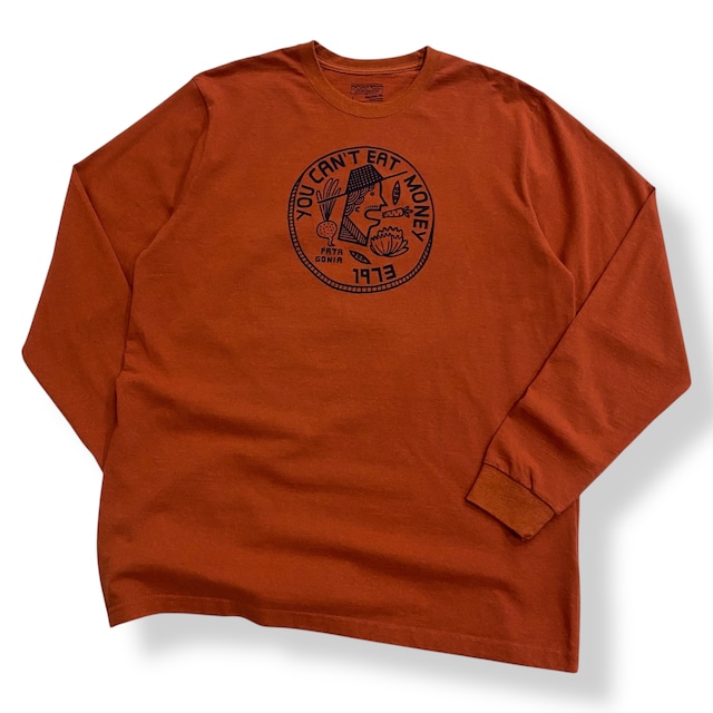 「You can’t eat money」のフレーズが入ったパタゴニアのプリントT! 環境保護や自然を大事にするパタゴニアの少し皮肉めいたフレーズが効いてますね◎ ボディはダークトーンのオレンジブラウン、イラストのタッチもかわいいです! お好きな方は是非! 《Size》: 表記 L 肩幅 47cm 身幅 56cm 着丈 72cm 袖丈(肩から袖口) 67cm 《Color》: Orange Brown 《Quality》: 50%Cotton,50%Polyester 《Condition》: Used バックに薄汚れ有(7枚目) ボディの目立つダメージや汚れは特に見受けられません。 《Attention》 ※ページトップの『※購入前に必ずご一読下さい※』を必ずお読み頂きご理解の上、購入手続きをよろしくお願いします。 ※サイズは平置き採寸になります、若干の誤差が生じる場合がございます。 ご理解の程宜しくお願い致します。 ※お使いのモニター・液晶によって実際の色味と異なる場合がございます。