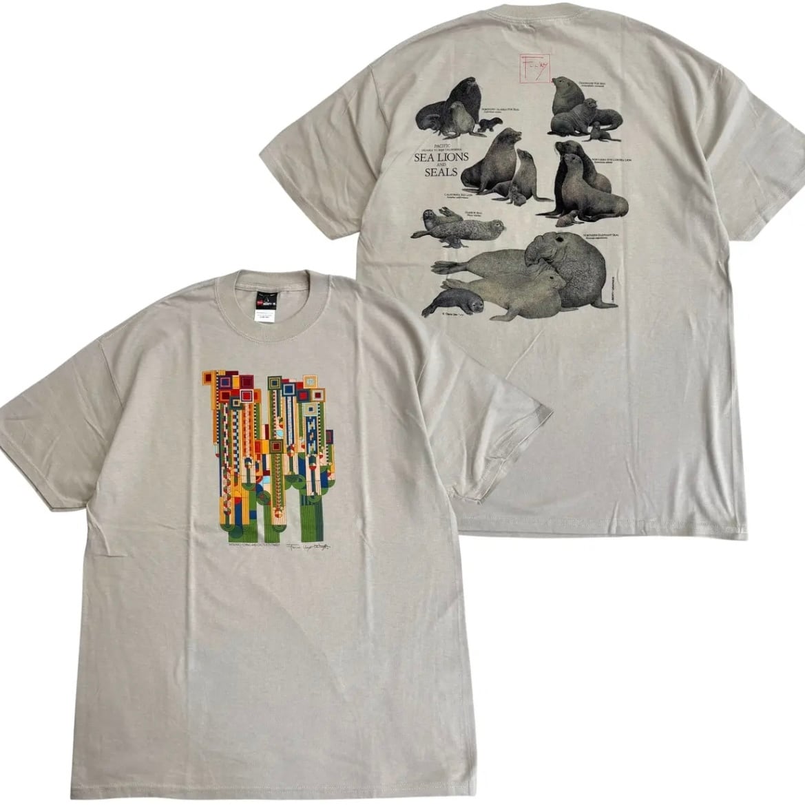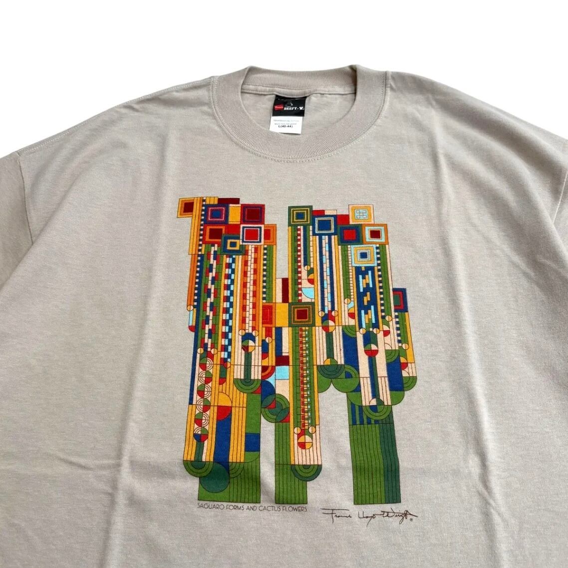 フロントは近代建築家の3大巨匠の1人である「Frank Lloyd Wright(フランクロイドライト)」の「サワロの形とサボテンの花」というアートワーク。このデザイン1927年当時は雑誌の表紙としてデザインされ、のちにアリゾナ・ビルトモア・リゾートホテルの入り口にてステンドグラスが設置されました!のちにポスターやジグソーパズルなど広く知られ人気になったアートワークです◎