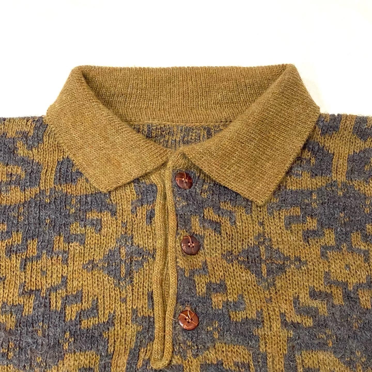 落ち着いたブラウンベースのニットポロ、形も身幅広くて着丈が長くないボックスシルエット最高ですね!